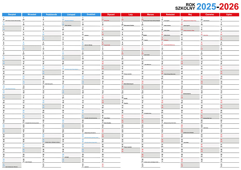 - układ kalendarza jest przystosowany do roku szkolnego . Kolorem niebieskim jest oznaczony rok 2024 na czerwono rok 2025
