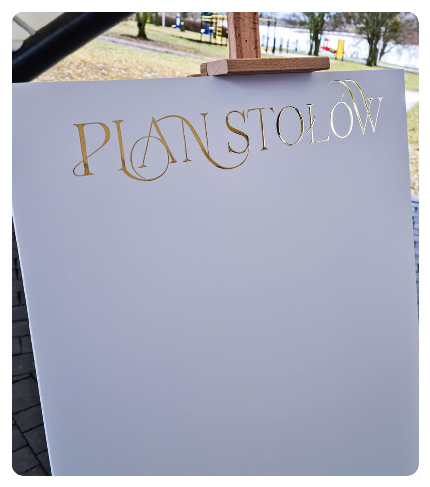 Jako jedyna w Polsce firma, oferujemy tablice z planem stołów wykonaną na pcv 5mm o wymiarach 70 x 50 cm wykonaną w technologii druku 3D złotą folią. Dbamy o każdy szczegół, w czym wspiera nas profesjonalny i zaawansowany technologicznie sprzęt. Dzięki temu stworzona przez nas tablica  wygląda bardzo estetycznie.